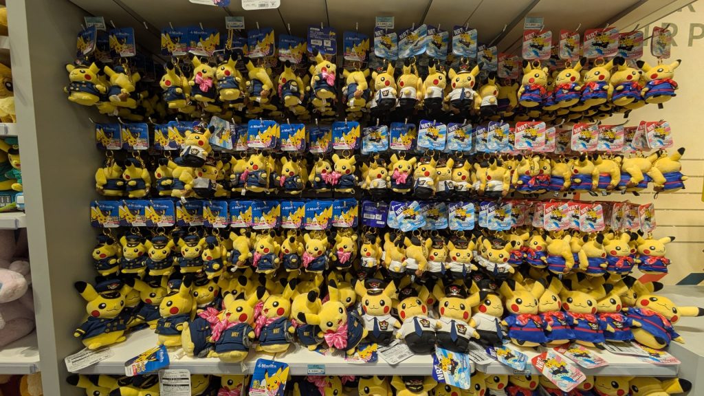 The highlight of the Narita Airport store is the lineup of Pokémon staff-themed Pikachu plushies available nowhere else.