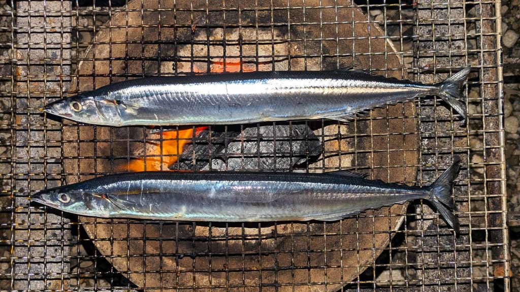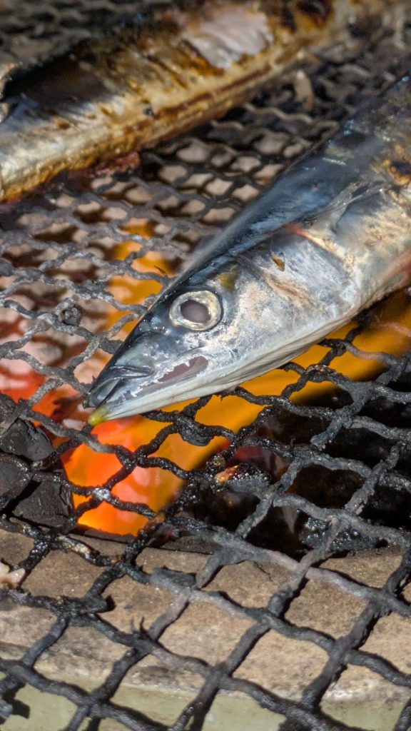 炎に滴る秋刀魚の油の香りが食欲を刺激します。