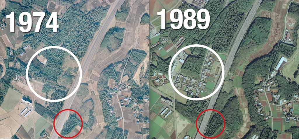 1974年時点では存在しませんでしたが1989年になると明らかに住宅が増えております。